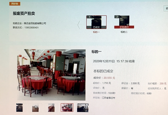 12月11日下午3時,城發(fā)公司部分報廢廚具、桌椅等物資網上拍賣開始,10家競買人,經過17分39秒90次的緊張激烈競價,最終以20555元成交標的,比評估價超出10倍。