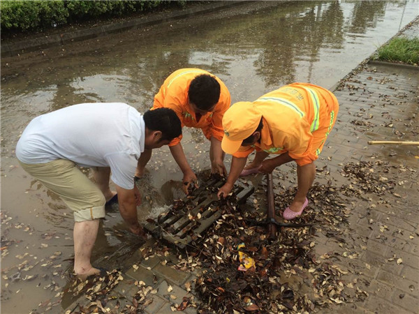 市政搶險(xiǎn)疏通小組迅速調(diào)集人員及物資力量,開(kāi)展區(qū)內(nèi)泄洪及排水工作。公舍等項(xiàng)目為迅速排澇,員工在水中冒雨架好水泵,安裝吸水管,鋪設(shè)排水水帶,發(fā)動(dòng)機(jī)器快速排水,使公舍車(chē)庫(kù)等水位快速下降。